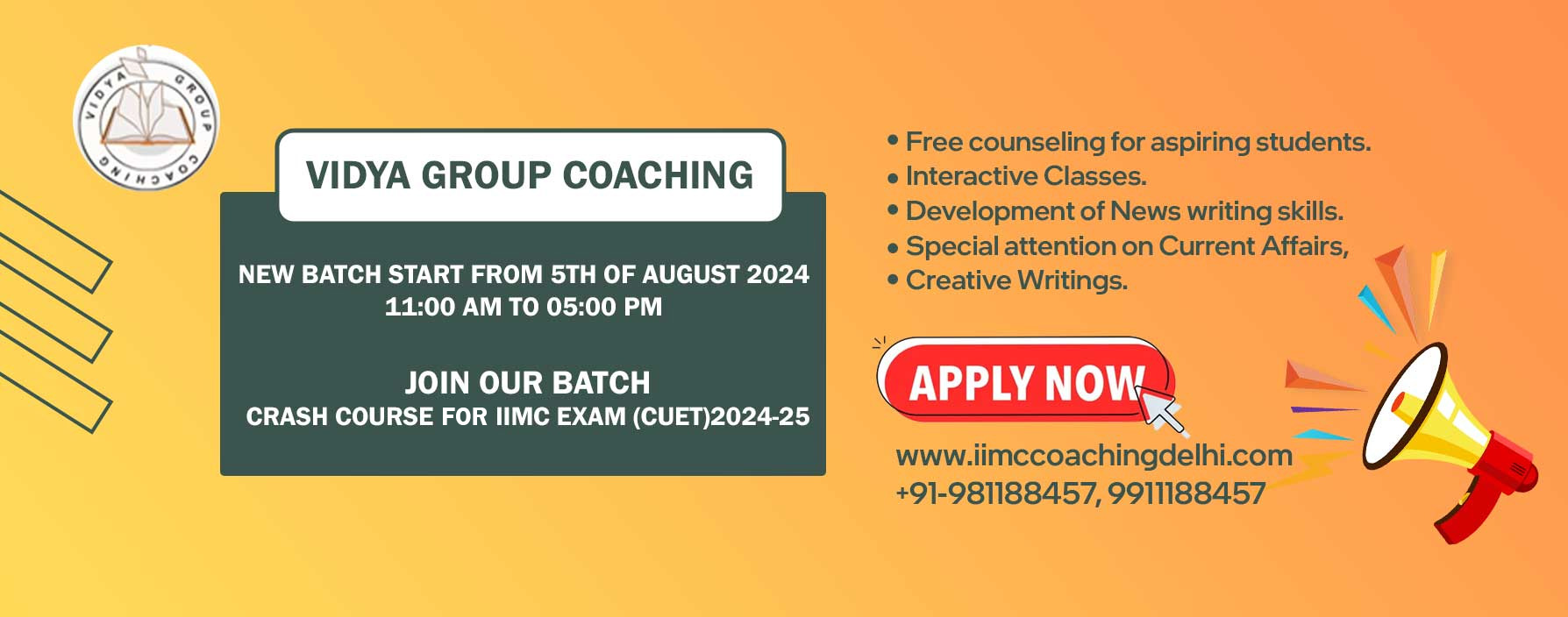 At Vidya Group Coaching, we strive to prepare the best students for India’s top media schools by providing exceptional study materials and expert faculty. We focus on quality over quantity, working with a select group of students to ensure meaningful and impactful training.